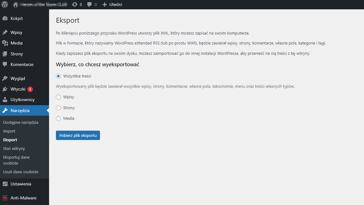 Eksportowanie treści do pliku domyślną funkcjonalnością WP