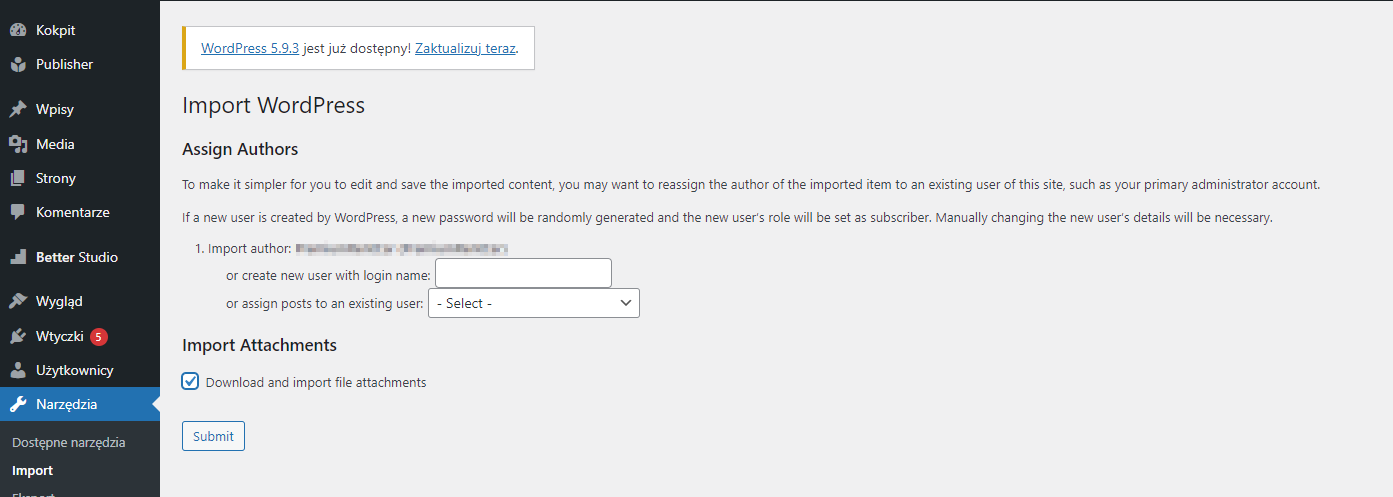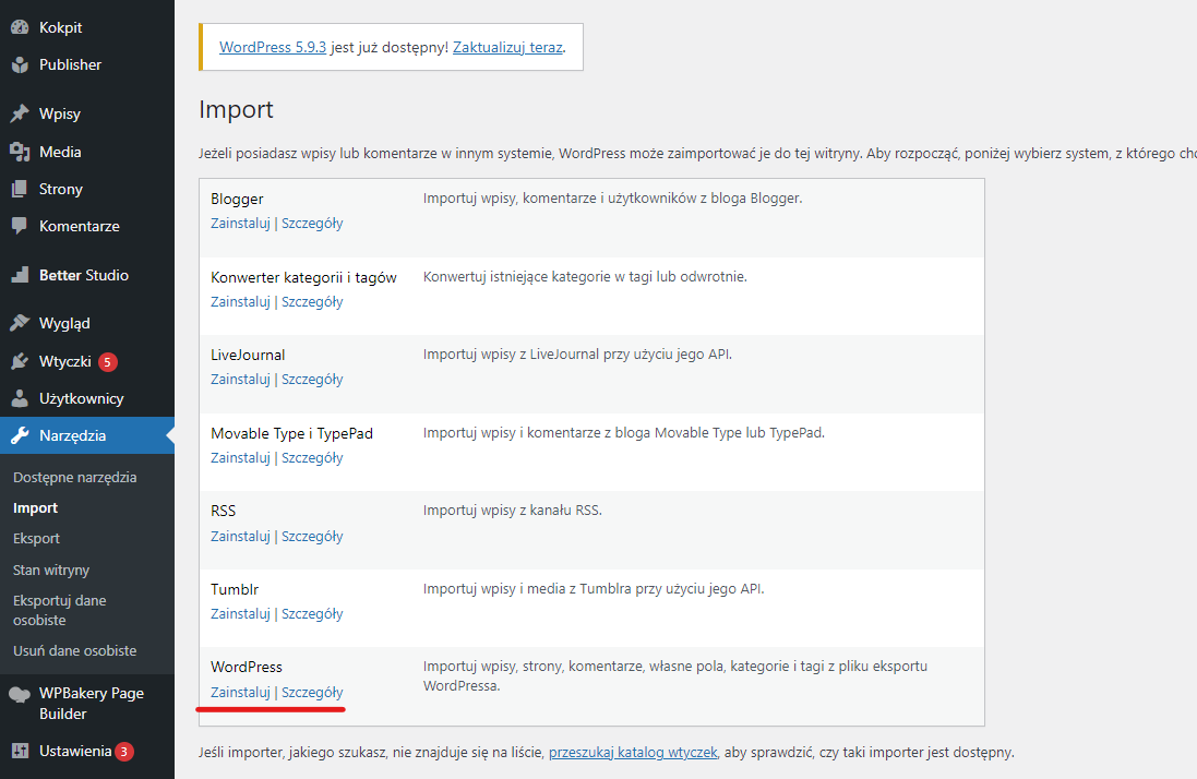 Operacja importowania jest równie prosta na nowym serwisie, co jej eksport na starym. Przechodząc do meritum, aby zaimportować pobraną treść należy przejść w panelu administracyjnym do sekcji “Narzędzia”, a następnie “Import”. Po przeładowaniu się serwisu, w dolnej części odszukać pozycję “Wordpress” i dokonać jej instalacji: