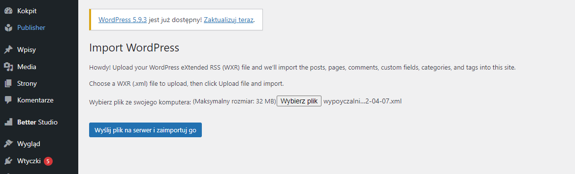 Po pobraniu pliku, będą w nim znajdować się wszystkie kategorie dostępne we wpisach, wpisy, strony oraz linki mediów.
