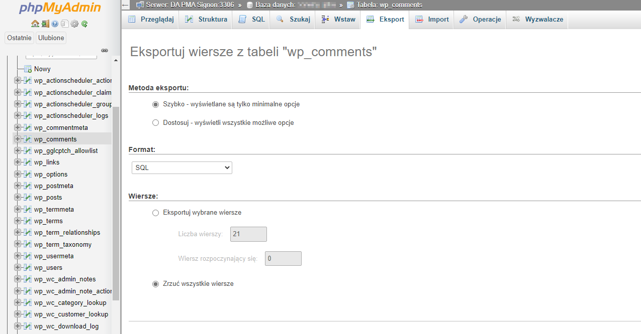 Myślę że będzie tutaj szybka piłka, gdyż najgorsze już za nami. Jesteśmy w posiadaniu zrzutów bazy danych z naszymi komentarzami. W kolejnym korku musimy zalogować się do bazy danych nowej strony internetowej, tak jak poprzednio poprzez phpmyadmin’a. Po zalogowaniu się do bazy warto zrobić kopie zapasową przed operacją, na wypadek jakby coś poszło nie tak. Dla przypomnienia wspomnę, że pobranie całej bazy danych polega na wybraniu z lewej belki jej nazwy, a nastepnie z górnej belki wybieramy eksport.