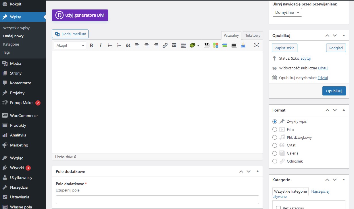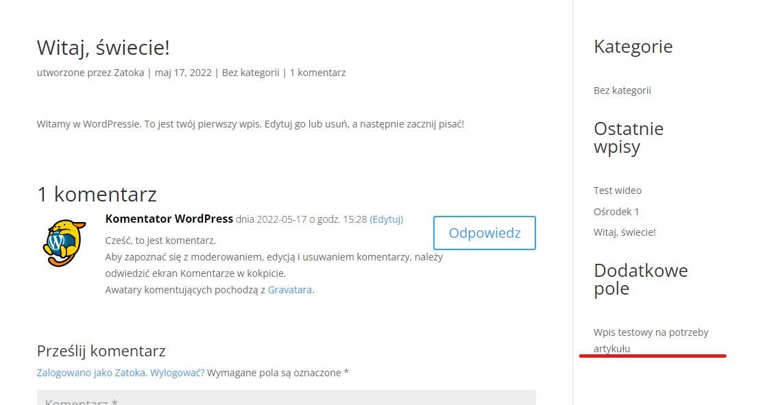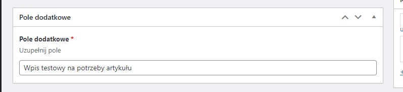Jeżeli podstawowe informacje uzupełniliśmy jak na powyższym zrzucie ekranu, możemy kliknąć “Opublikuj”. Tym sposobem pole mamy utworzone w panelu administracyjnym i po przejściu do wpisów, będziemy je widzieć w trybie edycji: